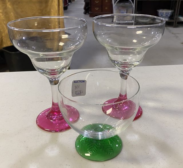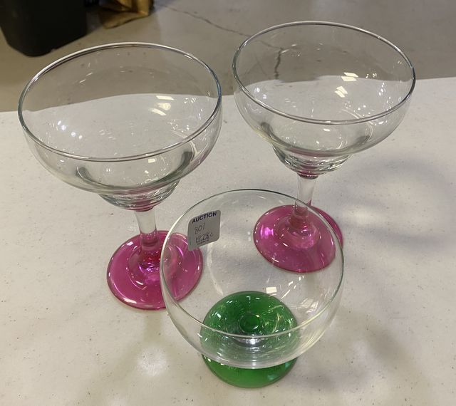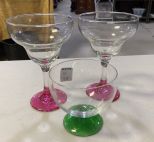 Two Martini Glasses, pink footed, 7"h. and Small Glass Stem Two Martini Glasses, pink footed, 7"h. and Small Glass Stem