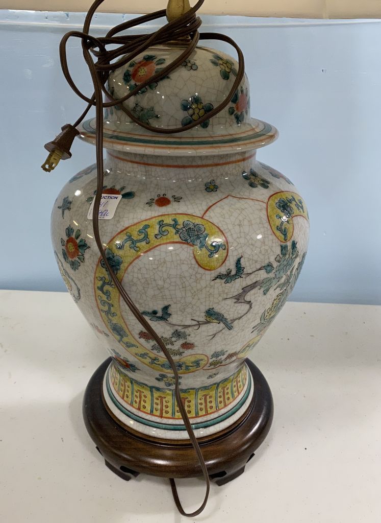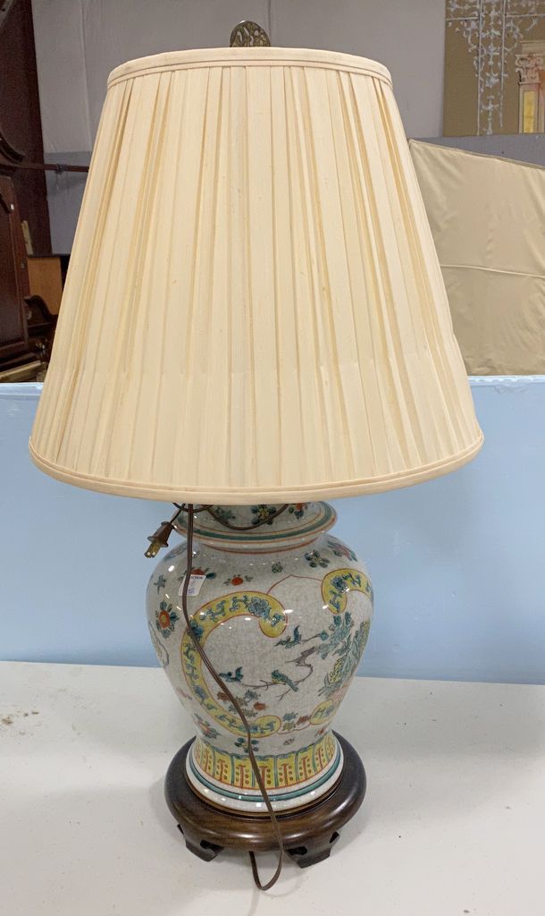 Large Porcelain Oriental Style Vase Lamp, floral design, wood base, with shade, 24"h. Large Porcelain Oriental Style Vase Lamp, floral design, wood base, with shade, 24"h.