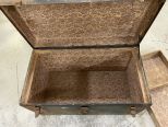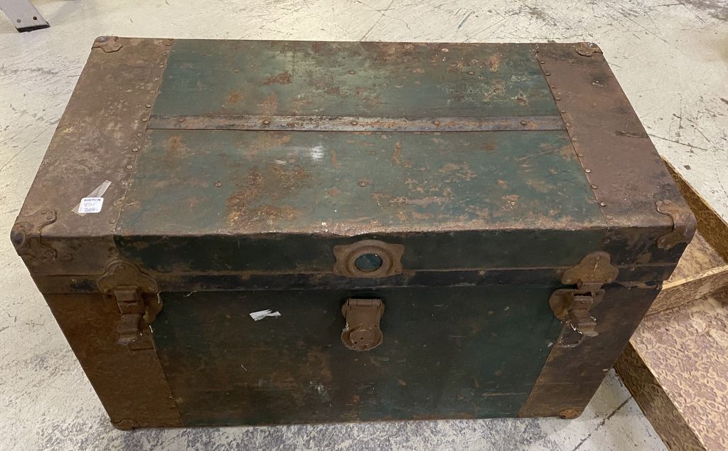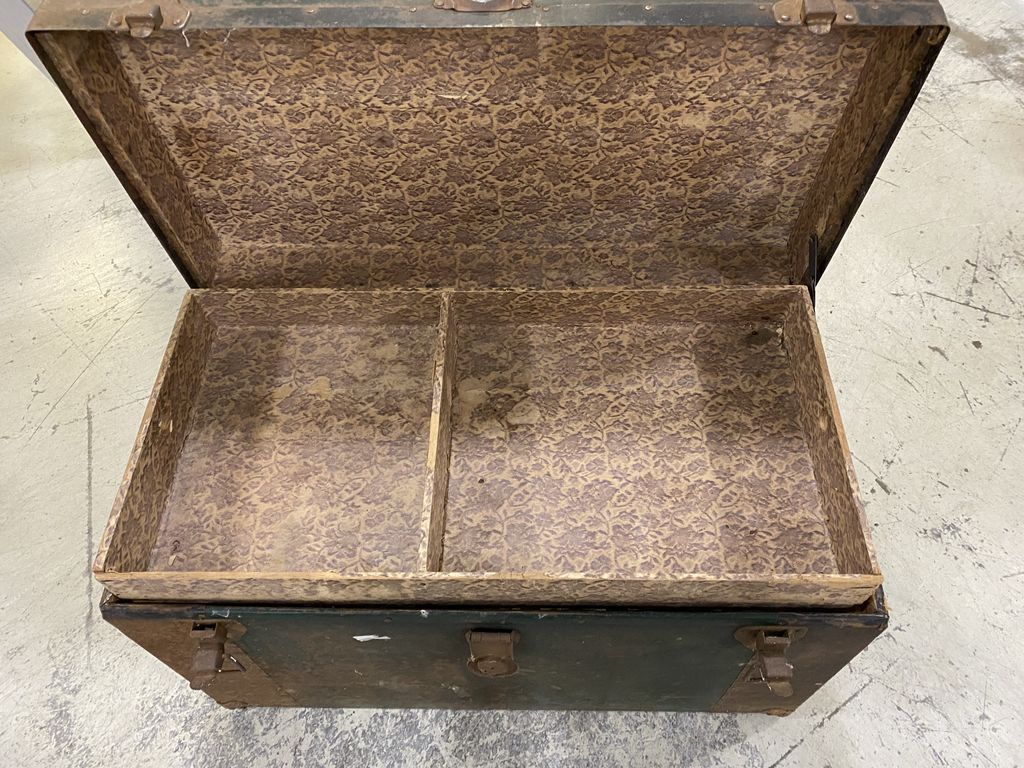 Old Metal Steamer Traveling Trunk, metal exterior, paper lined with tray, used condition, 20"h., 32"w. Old Metal Steamer Traveling Trunk, metal exterior, paper lined with tray, used condition, 20"h., 32"w.