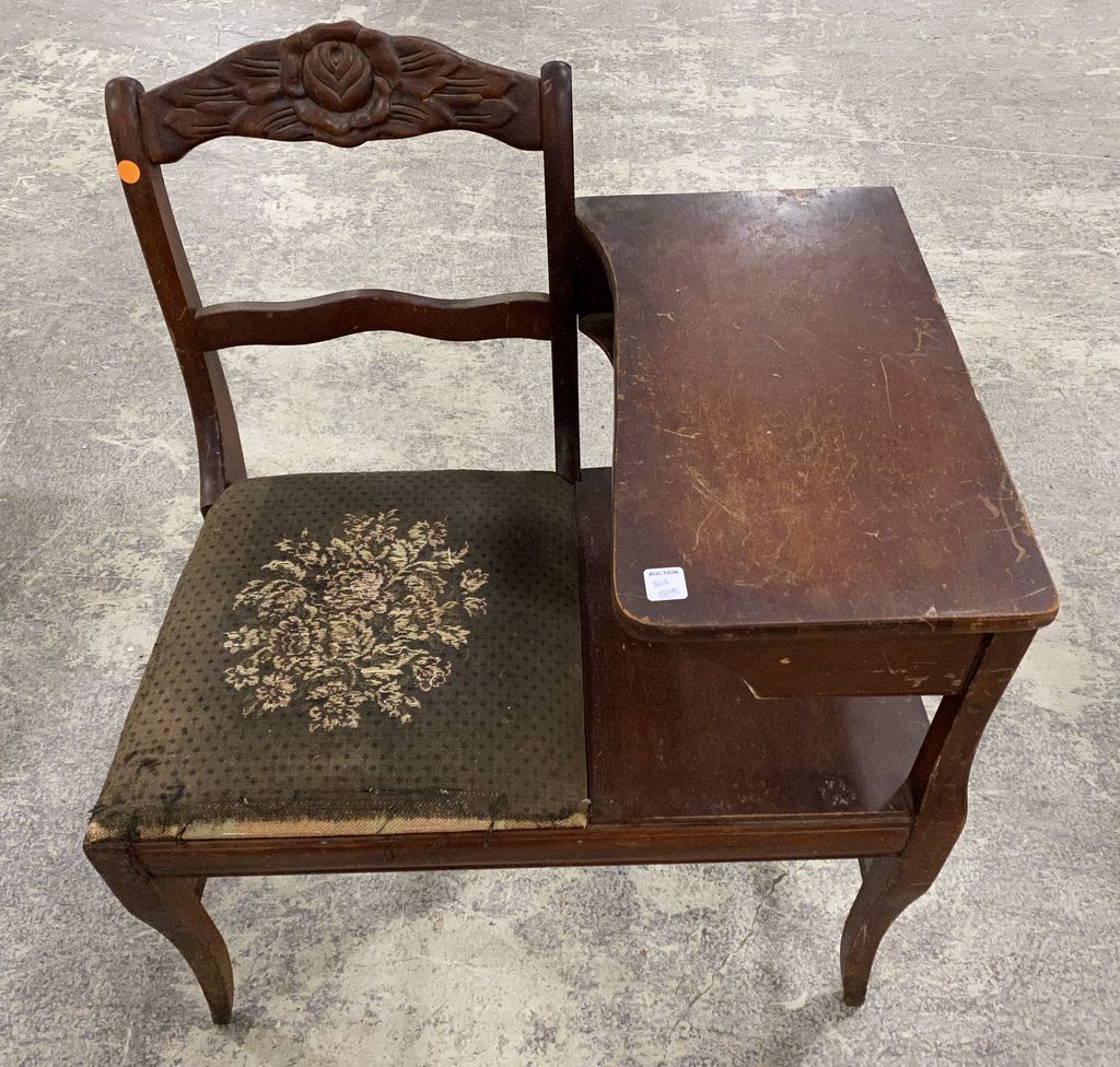 Vintage Mahogany Telephone Bench, Worn fabric seat, has scratches finish, 33"h., 28"w. Vintage Mahogany Telephone Bench, Worn fabric seat, has scratches finish, 33"h., 28"w.