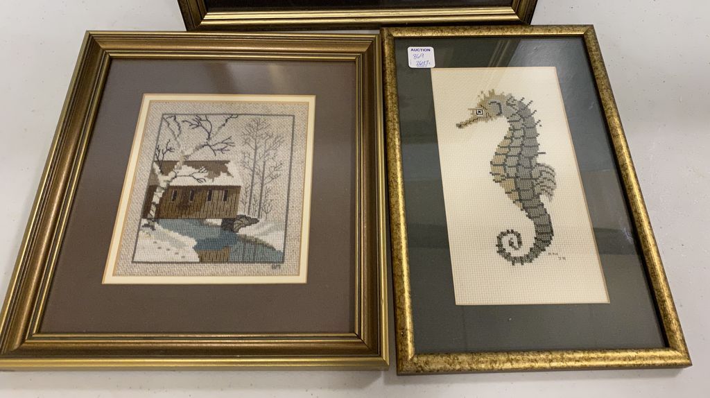 SF. 81 Giesha Girl Needle Point framed 13"h., 14"w., Rm 79 Seahorse Needle point 12"h., 8"w., Cabin needle point 12"h., 11"w. SF. 81 Giesha Girl Needle Point framed 13"h., 14"w., Rm 79 Seahorse Needle point 12"h., 8"w., Cabin needle point 12"h., 11"w.