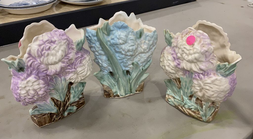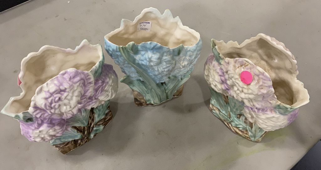 Three McCoy Pottery Vases, hand painted, light wear, 8"h. Three McCoy Pottery Vases, hand painted, light wear, 8"h.