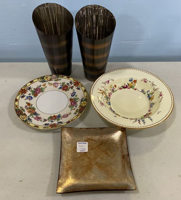 Slovakia porcelain plate, Staffordshire bowl, square glass plate, two metal holders. Slovakia porcelain plate, Staffordshire bowl, square glass plate, two metal holders.