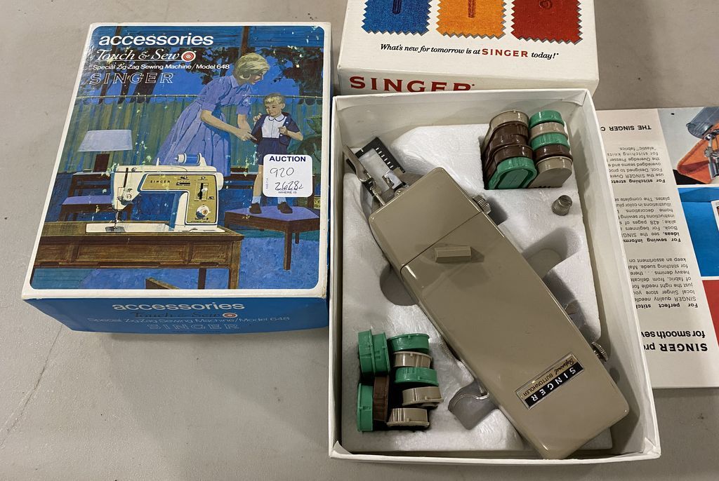 Singer Sewing Machine Buttonholer and Accessories, in original box. Singer Sewing Machine Buttonholer and Accessories, in original box.