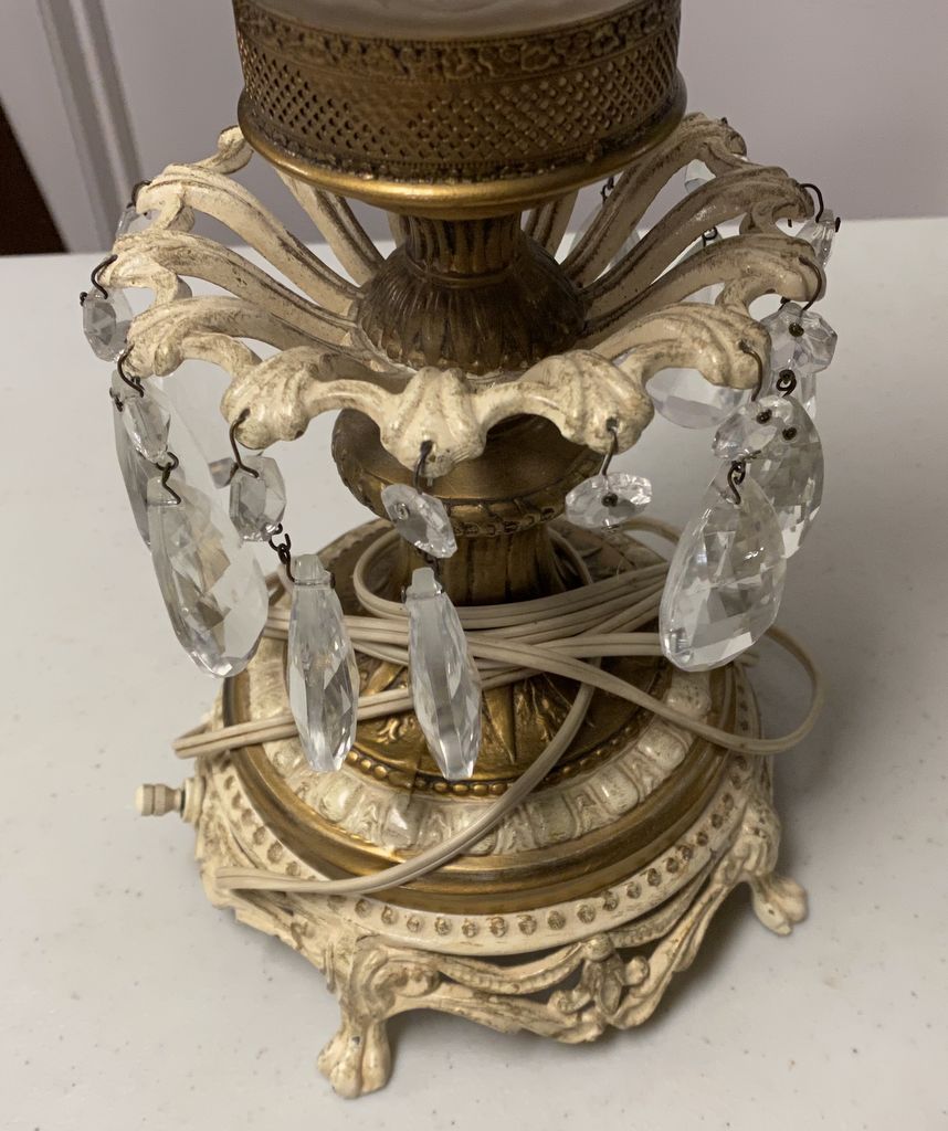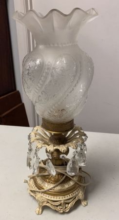 Vintage Globe Lamp, metal base with waterfall prisms, footed. Vintage Globe Lamp, metal base with waterfall prisms, footed.