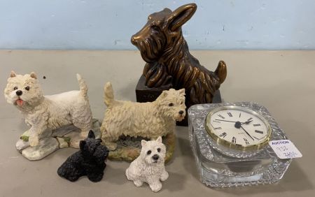 Scotty and Schnauzer figurines, Brass Schnauzer, Crystal desk clock. Scotty and Schnauzer figurines, Brass Schnauzer, Crystal desk clock.