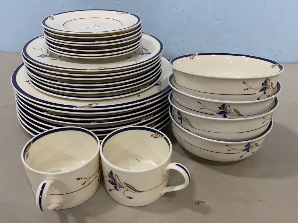 Gorham " Melon Bud" Town & Country China, 8 dinner plates, 7 salad plates, 2 mugs, 4 bowls, 7 dessert plates, several have rim chips. Gorham " Melon Bud" Town & Country China, 8 dinner plates, 7 salad plates, 2 mugs, 4 bowls, 7 dessert plates, several have rim chips.