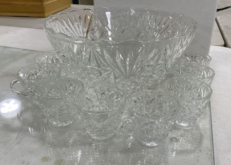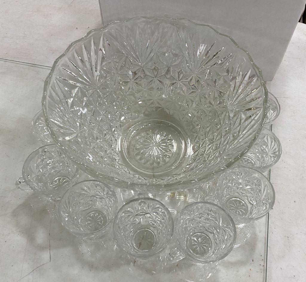 Pressed Glass Punch Bowl Set, bowl 6"h., 12"dia., with 8 matching cups. Pressed Glass Punch Bowl Set, bowl 6"h., 12"dia., with 8 matching cups.