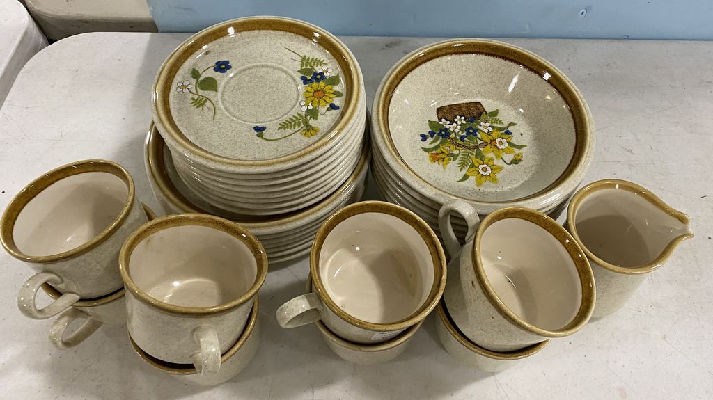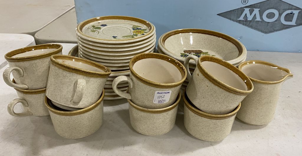 Mikasa Stone Manor Pottery Set, 7 bread & butter plates, 8 cups and saucers, creamer, 7 bowls. Mikasa Stone Manor Pottery Set, 7 bread & butter plates, 8 cups and saucers, creamer, 7 bowls.