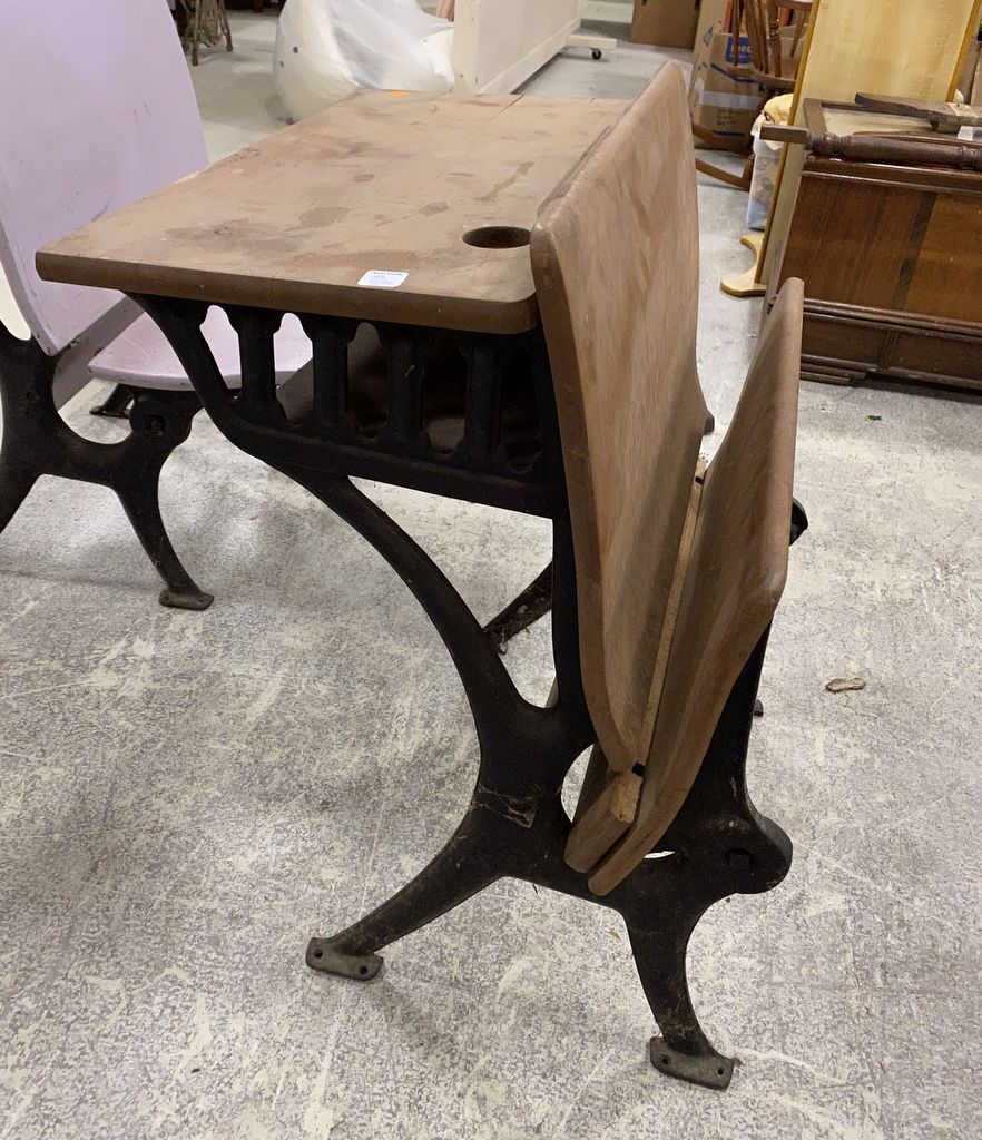 Vintage Child's School Desk, iron base, wood seat and desk, 28"h., 24"w. Vintage Child's School Desk, iron base, wood seat and desk, 28"h., 24"w.