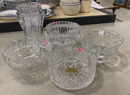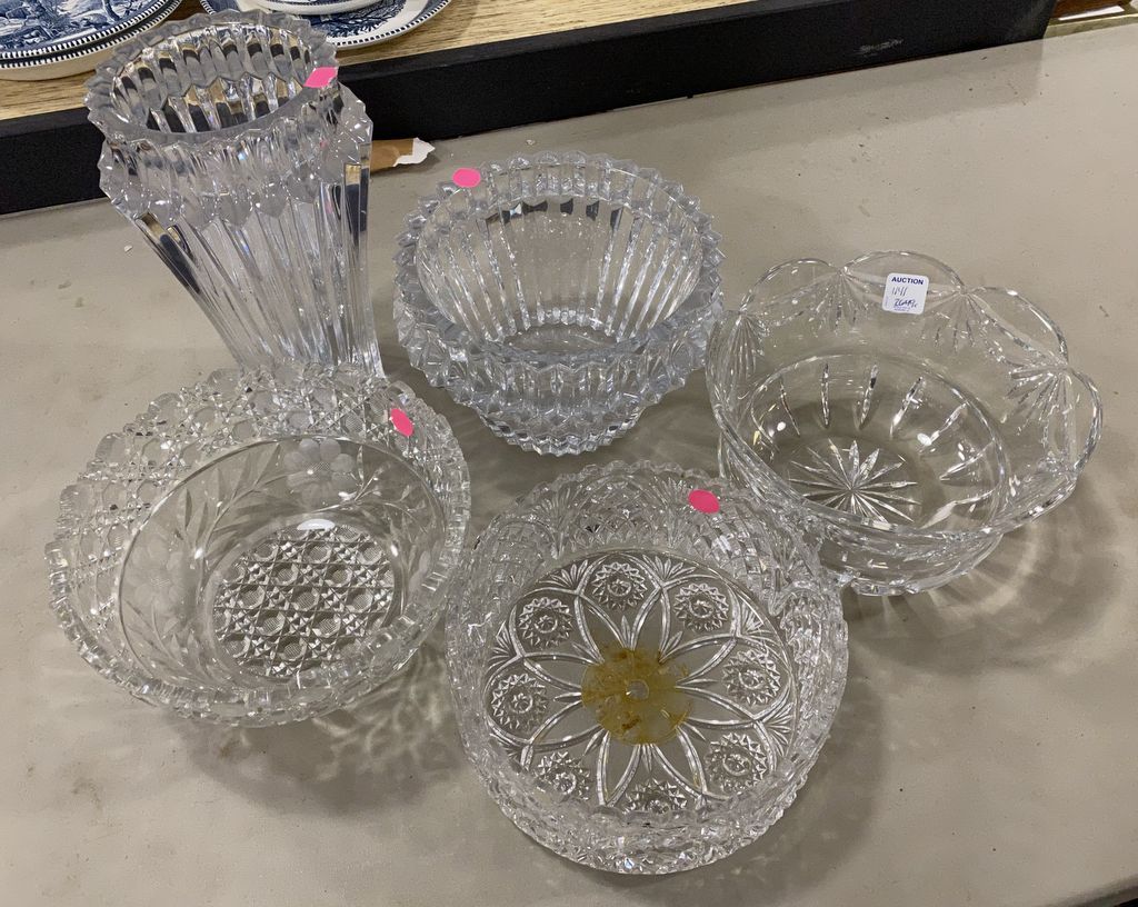 Group of Large Glass Serving Pieces, vase 10"h., four pressed glass bowls. Group of Large Glass Serving Pieces, vase 10"h., four pressed glass bowls.