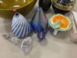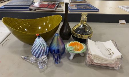 Pair of art glass vases, metal flower vase, liquor decanter, napkin holder, Waterford stopper, Pottery flower dish, footed, Shira Leah Salad bowl. Pair of art glass vases, metal flower vase, liquor decanter, napkin holder, Waterford stopper, Pottery flower dish, footed, Shira Leah Salad bowl.