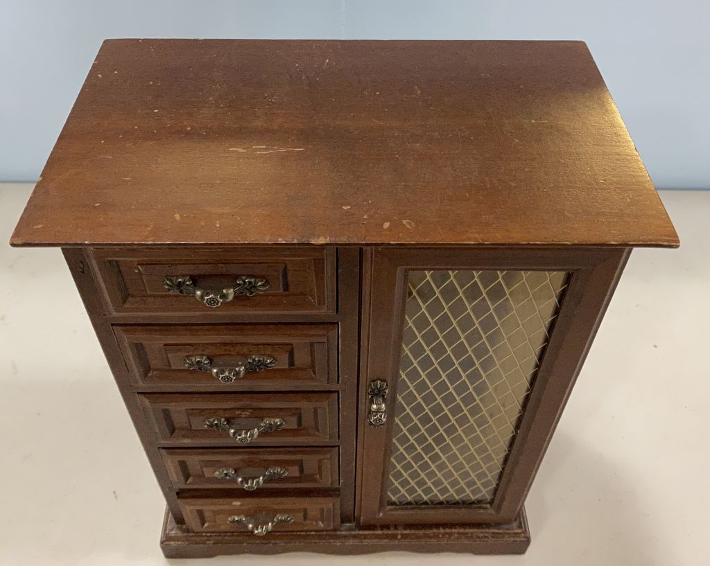 Small Cherry Jewelry Box, drawers, glass side door, light wear. Small Cherry Jewelry Box, drawers, glass side door, light wear.