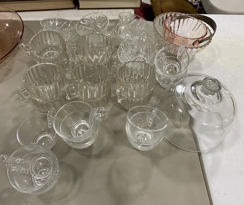 Group of Vintage Glass Punch Cups, three different styles, footed bowl, pink glass with metal handle, glass cover. Group of Vintage Glass Punch Cups, three different styles, footed bowl, pink glass with metal handle, glass cover.