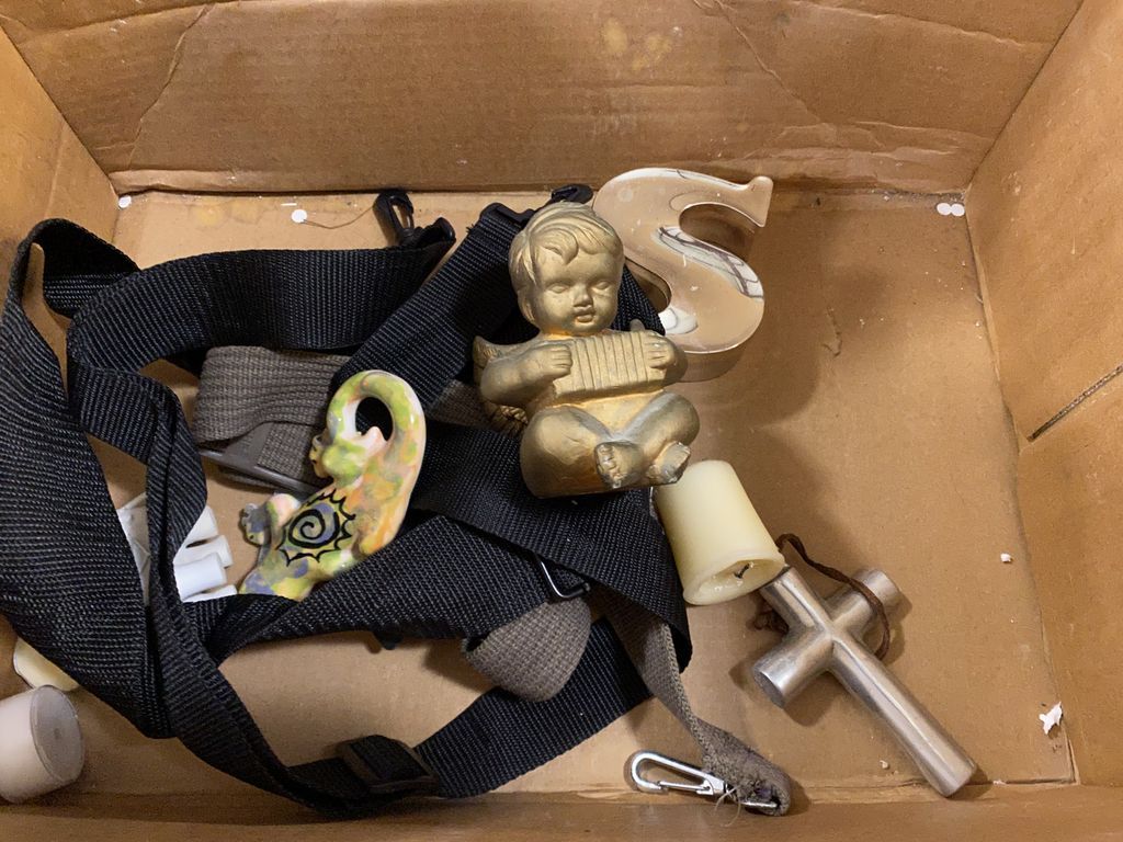 Stained glass piece, vases, cross, candle stand. Stained glass piece, vases, cross, candle stand.
