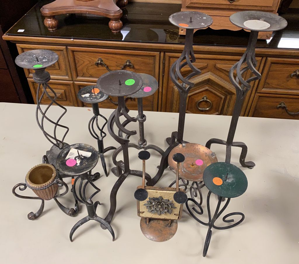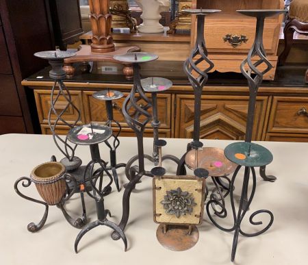 Group of Wrought Iron Candle Holders, assorted styles and heights. Group of Wrought Iron Candle Holders, assorted styles and heights.