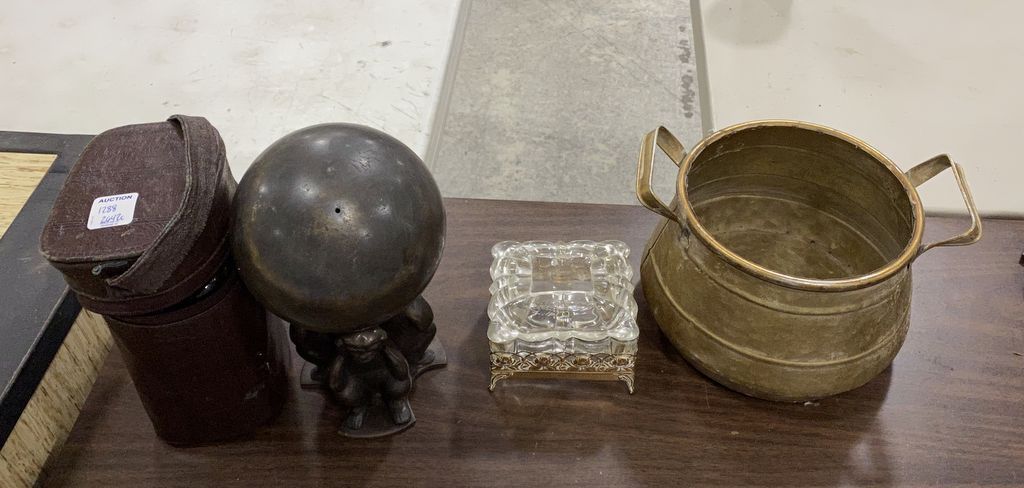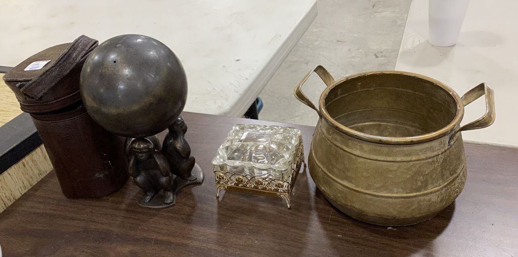 Whiskey Flasks, Monkey Decor, Glass Trinket, and Copper Pot Whiskey Flasks, Monkey Decor, Glass Trinket, and Copper Pot