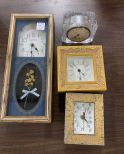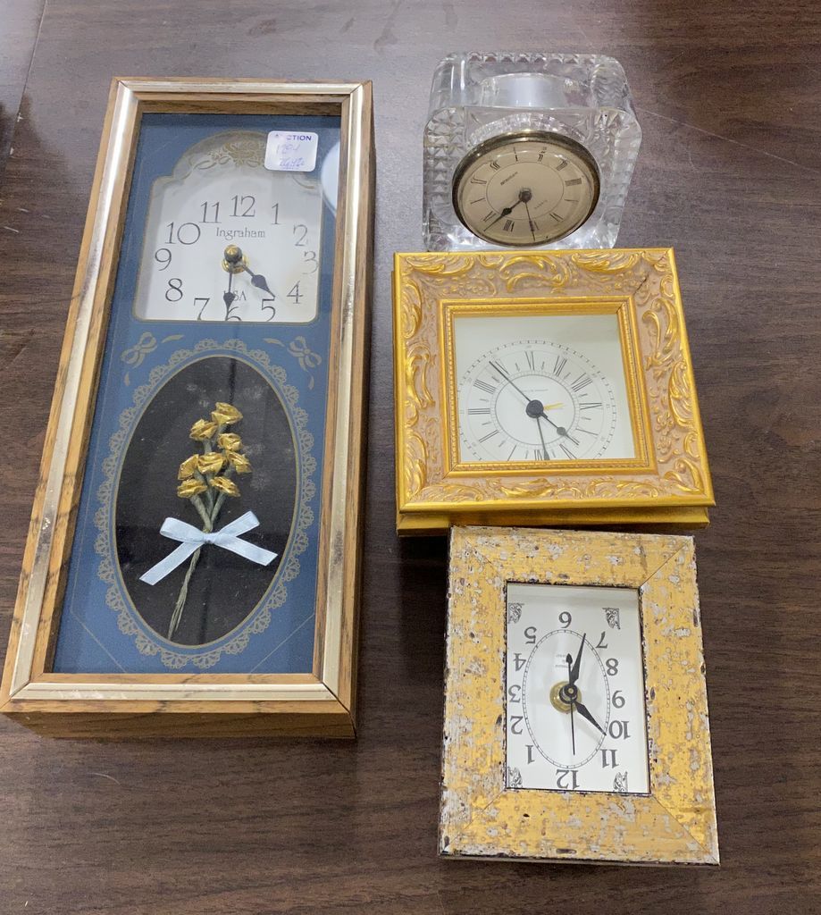 Ingraham battery wall clock, Stager Glass Clock, two framed clocks. Ingraham battery wall clock, Stager Glass Clock, two framed clocks.