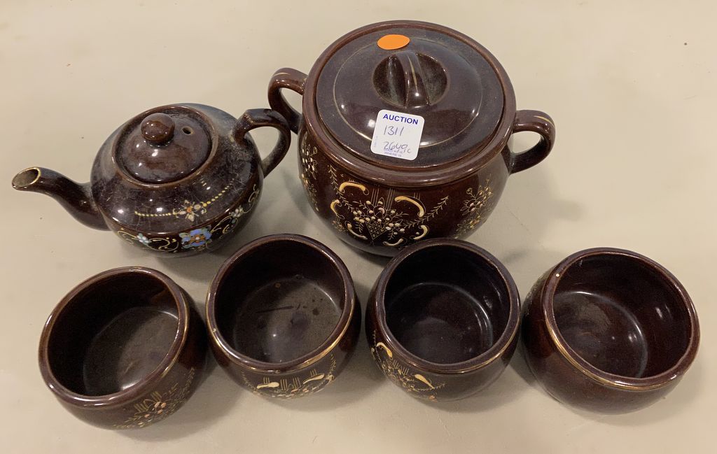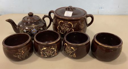 Japanese Stoneware Tea set, Pitcher, sugar, four cups, brown, used condition. Japanese Stoneware Tea set, Pitcher, sugar, four cups, brown, used condition.