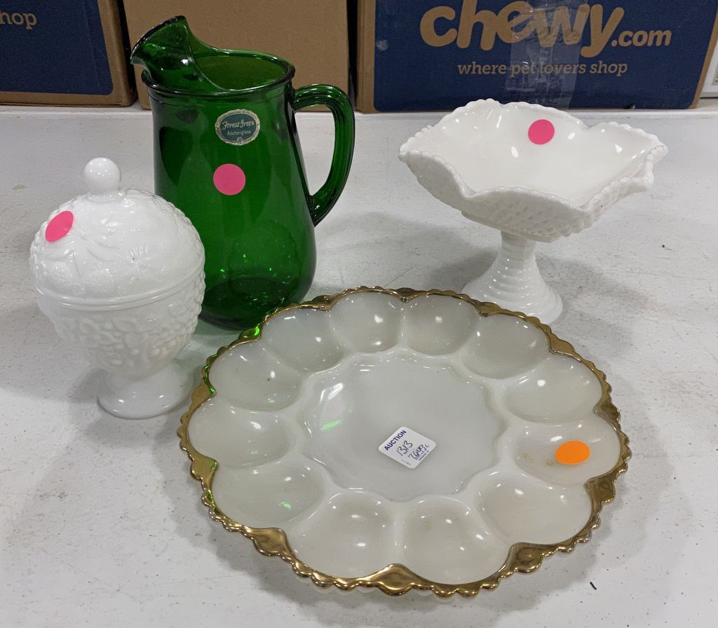 Anchor Glass Pitcher, Forest Green, 8"h., Milk Glass Egg Tray, Milk Glass Jar and Compote Anchor Glass Pitcher, Forest Green, 8"h., Milk Glass Egg Tray, Milk Glass Jar and Compote