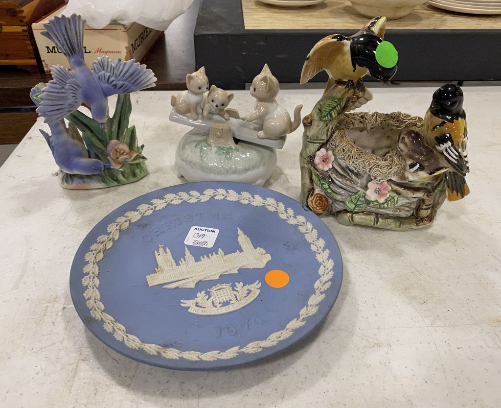 Ceramic Blue, Cats, and Bird nest figurines, and 8" Wedgwood plate with rim chip. Ceramic Blue, Cats, and Bird nest figurines, and 8" Wedgwood plate with rim chip.