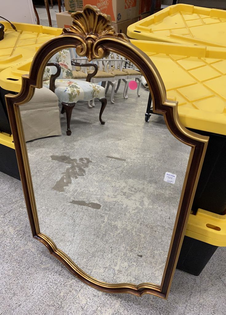Decorative French Style Plastic Mirror, plastic black and gold frame with shell crest, 36"h., 22"w. Decorative French Style Plastic Mirror, plastic black and gold frame with shell crest, 36"h., 22"w.