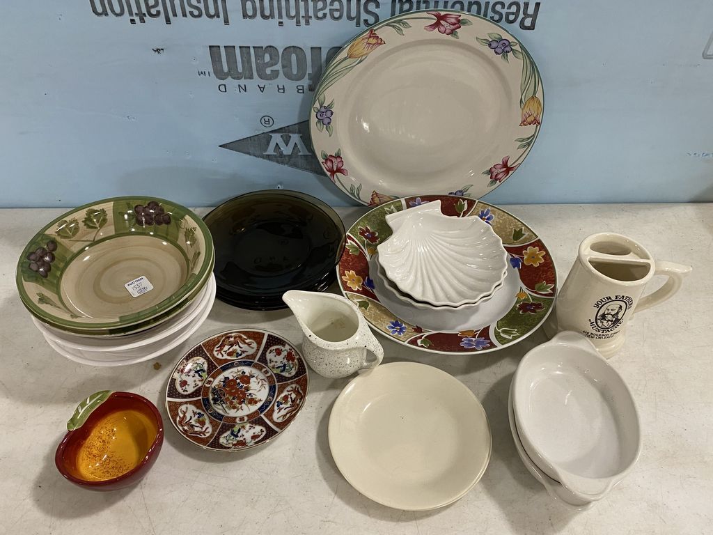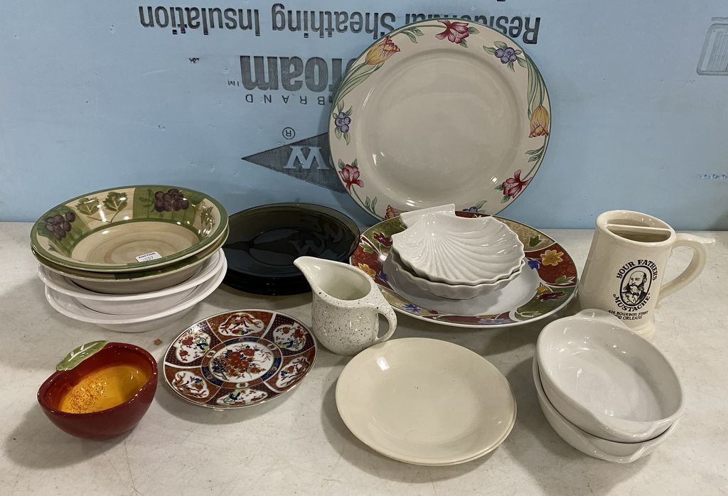 Two large charger plates, four bowls, dishes, Mustache mug, apple bowl, two shell dish, pitcher, Imari style plate, 5 green glass plates. Two large charger plates, four bowls, dishes, Mustache mug, apple bowl, two shell dish, pitcher, Imari style plate, 5 green glass plates.
