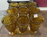 9 Whitehall Amber Drinking Glasses, cube pattern, 6"h. 9 Whitehall Amber Drinking Glasses, cube pattern, 6"h.