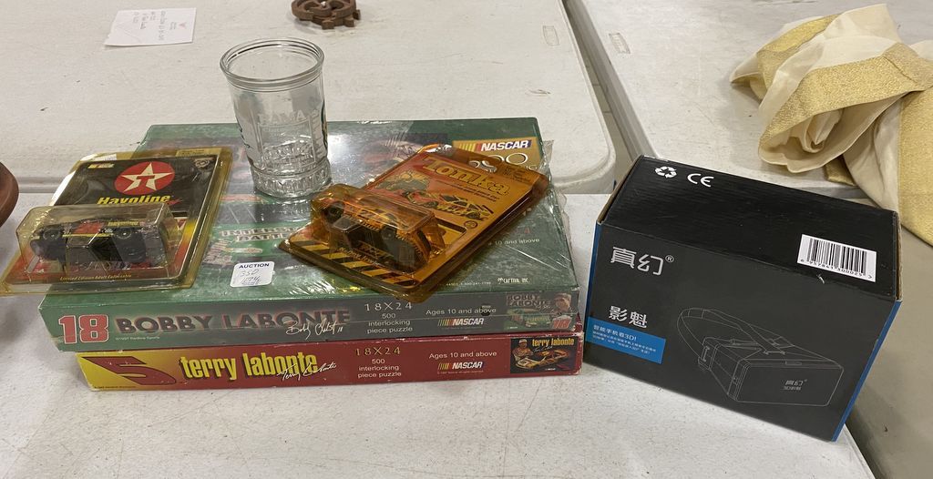Two Nascar puzzles, Kenny Irwin Model Cars, Dale Jarret cup, and VR goggles. Two Nascar puzzles, Kenny Irwin Model Cars, Dale Jarret cup, and VR goggles.