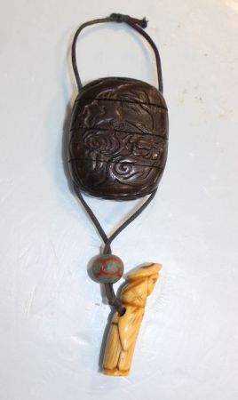 With carved bone figure. Also has a sliding clay ball. With carved bone figure. Also has a sliding clay ball.