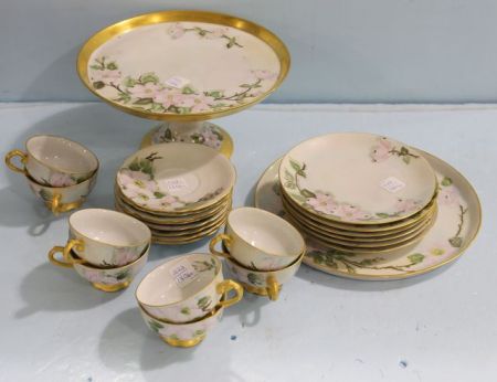 On miscellaneous blanks. Consists of a cake stand, cake plate, eight cups, eight saucers and six cake plates. May have chips. On miscellaneous blanks. Consists of a cake stand, cake plate, eight cups, eight saucers and six cake plates. May have chips.