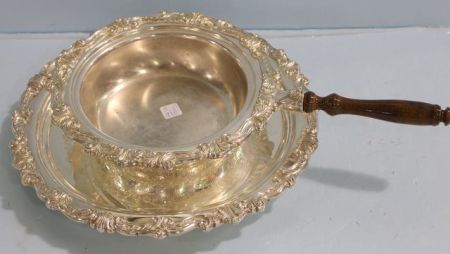 Silverplate piece with wooden handle and silverplate footed tray. Silverplate piece with wooden handle and silverplate footed tray.