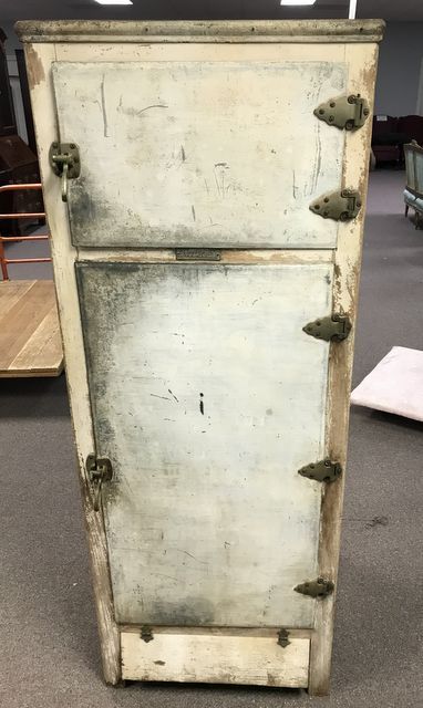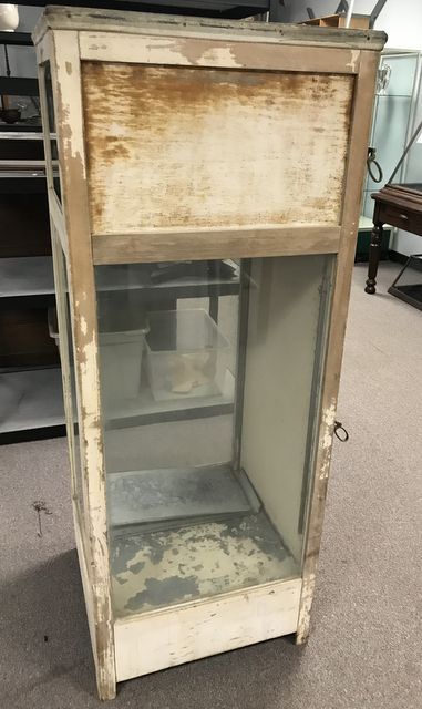 Elmer's Chocolate Company, Display cabinet, ice box, 1890s, glass, distressed, aged, mirror brand emblem, was on antique road show, 62"h., 23"sq. Elmer's Chocolate Company, Display cabinet, ice box, 1890s, glass, distressed, aged, mirror brand emblem, was on antique road show, 62"h., 23"sq.