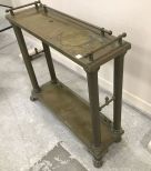 Unique brass wall console stand, two tier with column supports, footed, wood frame, has some tarnish, 32"h., 34"w., 10"d. Unique brass wall console stand, two tier with column supports, footed, wood frame, has some tarnish, 32"h., 34"w., 10"d.
