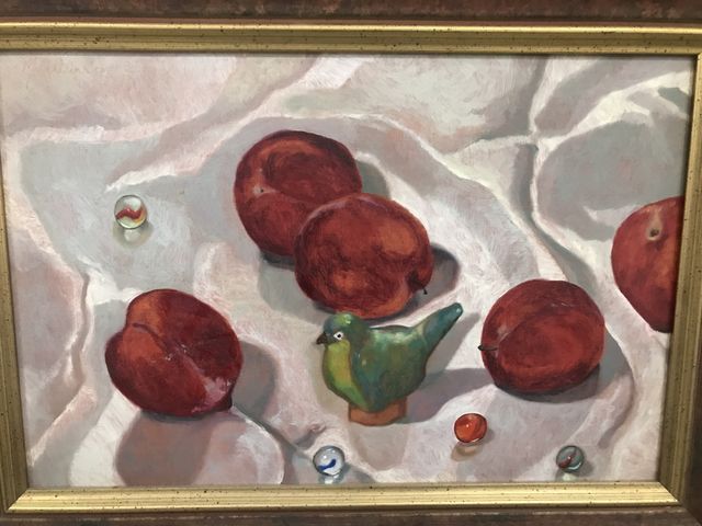 "Red Plums and Wolfe Bird" Painting by Melanie Atkinson, painted on board, frame is 15"h., 20"w. Mississippi Artist, Hinds CC teacher, chairwoman of the college's fine art department. "Red Plums and Wolfe Bird" Painting by Melanie Atkinson, painted on board, frame is 15"h., 20"w. Mississippi Artist, Hinds CC teacher, chairwoman of the college's fine art department.