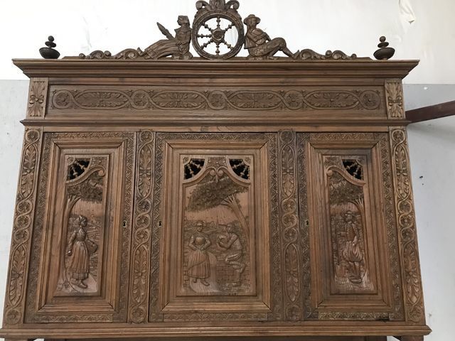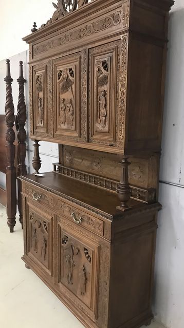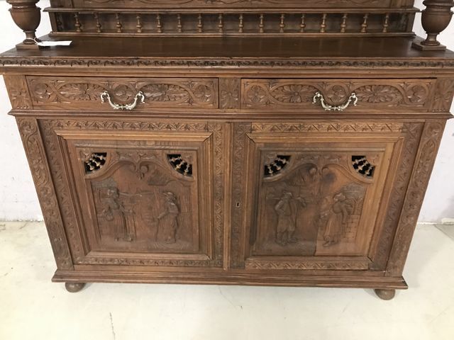 Heavily carved oak buffet with figural scenery carved door art and crest. Carved ornate border trim thru out the whole piece, two pieces, triple door top with shelves, double door bottom with two drawers, 104"h., 59"w., 19"d. Heavily carved oak buffet with figural scenery carved door art and crest. Carved ornate border trim thru out the whole piece, two pieces, triple door top with shelves, double door bottom with two drawers, 104"h., 59"w., 19"d.