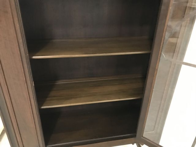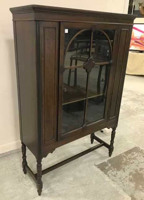 Vintage single door Walnut china cabinet, glass door, two inner shelves with plate display grooves, has key, 61"h., 41"w., 15"d. Vintage single door Walnut china cabinet, glass door, two inner shelves with plate display grooves, has key, 61"h., 41"w., 15"d.