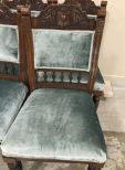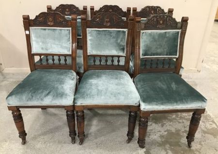 Six English, ornate carved side dining chairs, front wheels, upholstered seat and back, good condition, 36"h. Six English, ornate carved side dining chairs, front wheels, upholstered seat and back, good condition, 36"h.