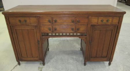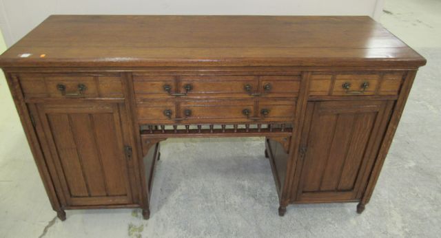 French style oak sideboard, has split pedestal design, four drawers (one needs bracket), double door storage, no key, has splits on top and sides, 37"h., 65"w., 21"d. French style oak sideboard, has split pedestal design, four drawers (one needs bracket), double door storage, no key, has splits on top and sides, 37"h., 65"w., 21"d.