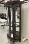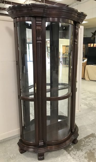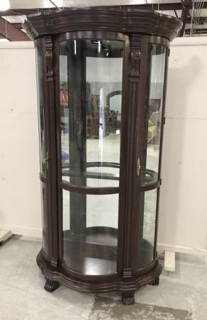 Modern large bow front glass curio cabinet, side doors, three glass shelves, lighted display, footed, has some finish wear, 80"h., 40"w. Modern large bow front glass curio cabinet, side doors, three glass shelves, lighted display, footed, has some finish wear, 80"h., 40"w.