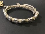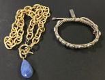 Gold tone chain necklace with blue pendent, and corded Blessed religious bracelet. Gold tone chain necklace with blue pendent, and corded Blessed religious bracelet.