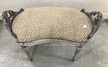 French Provincial style distressed painted vanity bench, ornate carved, leopard print upholstery, removable seat, 22"h., 31"w. French Provincial style distressed painted vanity bench, ornate carved, leopard print upholstery, removable seat, 22"h., 31"w.