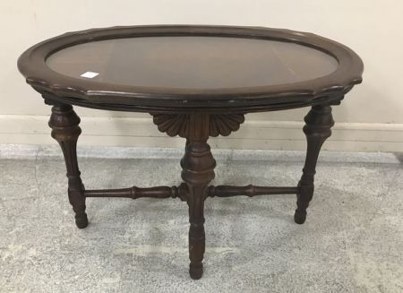 Walnut ornate carved base with inlaid wood top, glass serving tray, good condition, 19"h., 28"w. Walnut ornate carved base with inlaid wood top, glass serving tray, good condition, 19"h., 28"w.