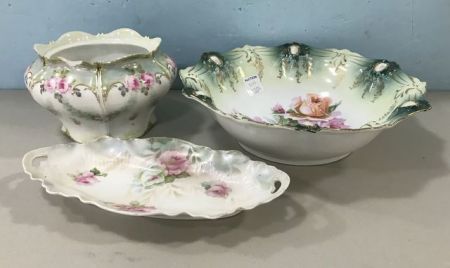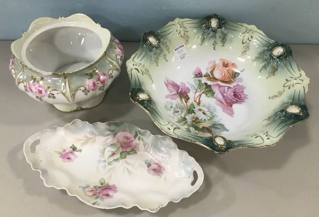 R.S. Prussia jar with no lid, hand painted, 4"h., 6"w., R.S. Prussia hand painted porcelain bowl 3"h., 11"dia., R.S. Prussia hand painted dish. R.S. Prussia jar with no lid, hand painted, 4"h., 6"w., R.S. Prussia hand painted porcelain bowl 3"h., 11"dia., R.S. Prussia hand painted dish.