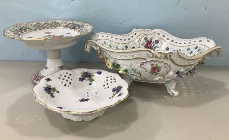 Dresden flowers German porcelain basket, 4"h., 12"w., Schumann Germany Chateau "Dresden Flowers" Compote 5"h., 8"dia., Sweet Violet bowl. Dresden flowers German porcelain basket, 4"h., 12"w., Schumann Germany Chateau "Dresden Flowers" Compote 5"h., 8"dia., Sweet Violet bowl.