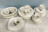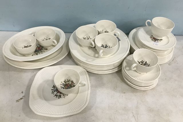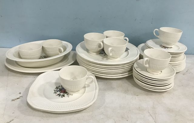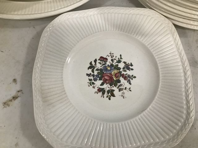Made in England, 9 dinner plates, 8 salad plates, 8 dessert plates, 8 cups, bowl, platters. Made in England, 9 dinner plates, 8 salad plates, 8 dessert plates, 8 cups, bowl, platters.
