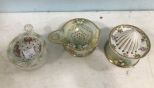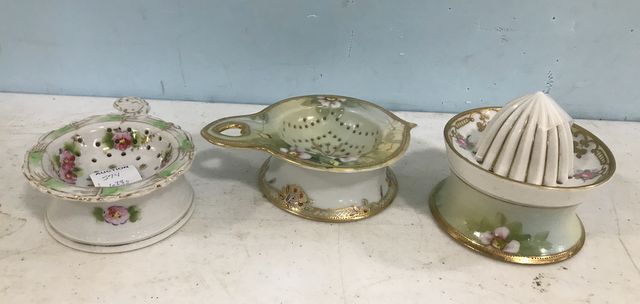 Three Nippon strainers, hand painted porcelain strainers, floral pattern with gold trim. Three Nippon strainers, hand painted porcelain strainers, floral pattern with gold trim.