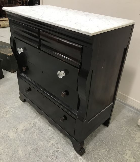 Antique Empire style marble top chest of drawers, five drawers, needs some work, Italian white marble top, dark finish, 45"h., 43"w., 21"d. Antique Empire style marble top chest of drawers, five drawers, needs some work, Italian white marble top, dark finish, 45"h., 43"w., 21"d.