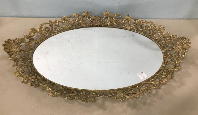 Large gold metal filligree mirror dresser tray, 27"w., 17"d. Large gold metal filligree mirror dresser tray, 27"w., 17"d.