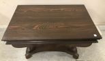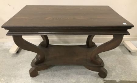 Vintage Empire Style library table, two tier, stained oak, has some scratches and wear, is sturdy, 28"h., 42"w., 26"d. Vintage Empire Style library table, two tier, stained oak, has some scratches and wear, is sturdy, 28"h., 42"w., 26"d.